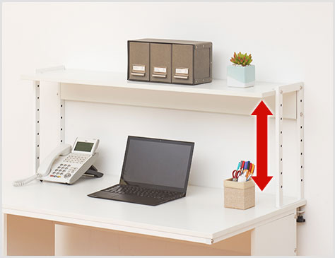 机上ラックの奥行はA4サイズがすっぽり入る300mmで、本やファイル、道具や書類などがたっぷり収納できます。耐荷重は1段20kgと丈夫なので、モニター台としても使用可能。用途やお好みに合わせて段の高さを調節して、机周りをスッキリまとめて快適なデスクワークを行えます。