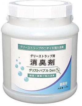 グリストバブルは過炭酸ナトリウム配合、卵の腐った匂い、硫黄の臭い、これは悪臭防止法で定められている硫化水素が原因です、不快感だけではなく命の危険性もある物質、早急に悪臭を除去しなければ危険。硫化水素に即効で効くのは過炭酸ナトリウムです、グリストバブルDEOは過炭酸ナトリウムに酵素を加え従来商品とまったく違うパワーで即効消臭、毒劇物を一切使用していないため環境、人、設備が安全です。とにかく簡単な手順で作業が楽になります。当然清掃時間が手間を減らし削減できます。主成分が酵素系漂白剤にも使用されている過炭酸ナトリウムで有機物の分解に優れた特殊な酵素です。それに蛋白質分解酵素、澱粉分解酵素、脂肪分解酵素をたっぷり配合しています、消臭と同時にグリストラップの環境も整えます。試験結果データが示すように、とにかく強力に消臭いたします。業務用消臭剤として嬉しい価格設定にもなっております。発売と同時に飲食店の皆様から注目されているグリストラップ消臭剤を是非ご利用ください。