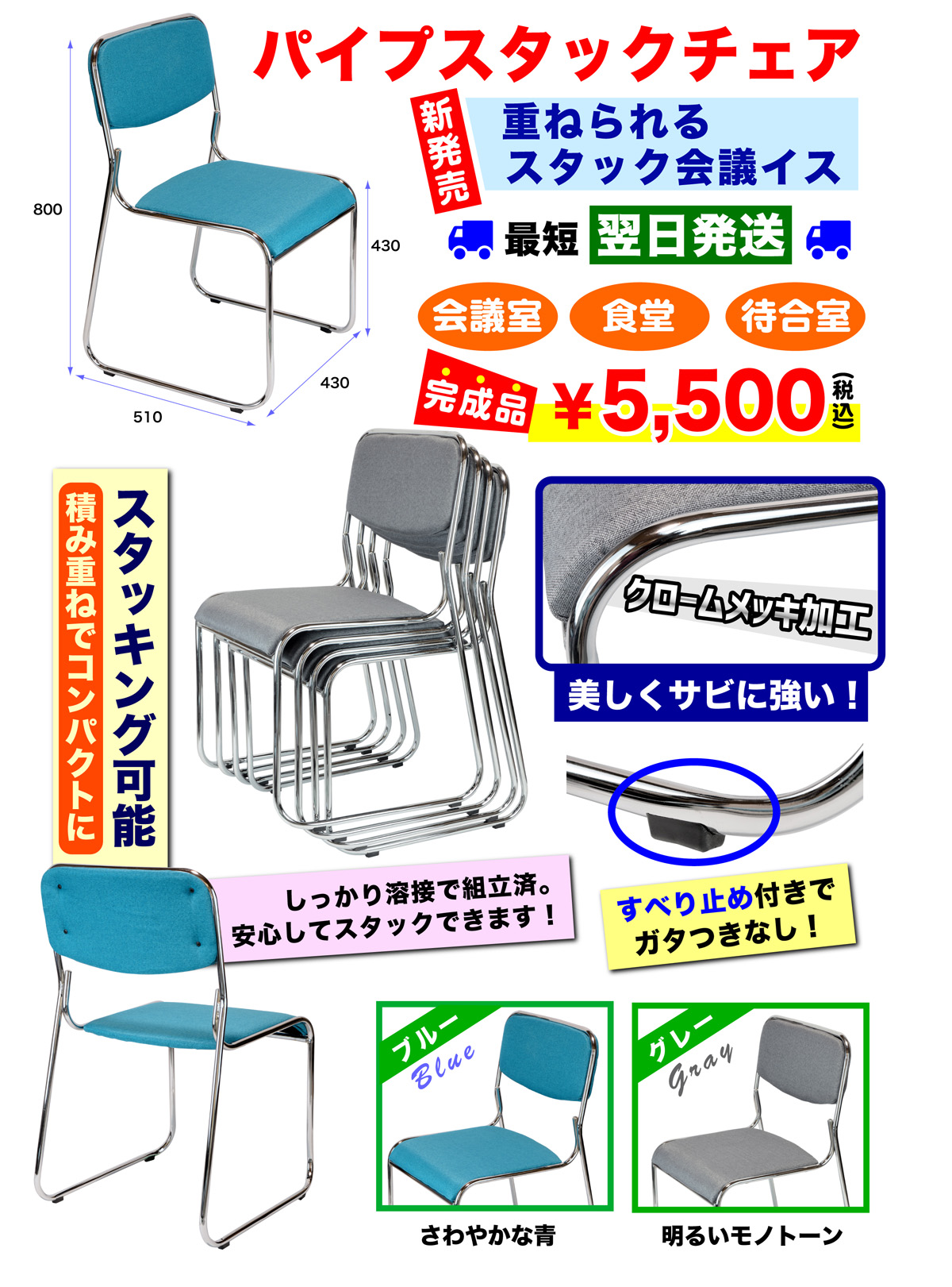 【サイズ】W540×D535×H783mm【カラー】ブルー、グレー【材質】背:成型合板ウレタンフォーム布張り、裏はPP樹脂カバー座:成型合板ウレタンフォーム布張り脚・フレーム:スチール【機能】スタック機能