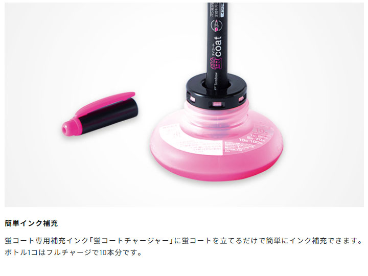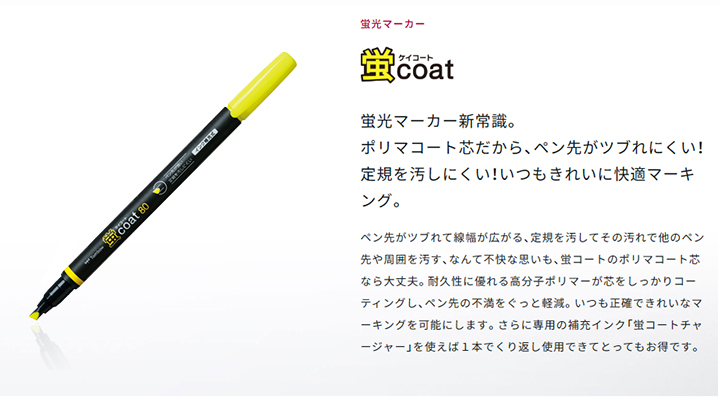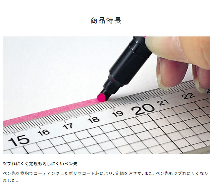| ペン先が強くツブれない、定規が汚れない、ポリマコート芯の水性蛍光マーカー |
