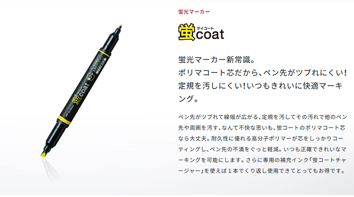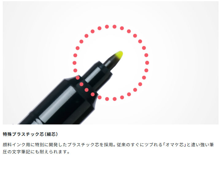 | ペン先が強くツブれない、定規が汚れない、ポリマコート芯の水性蛍光マーカー |