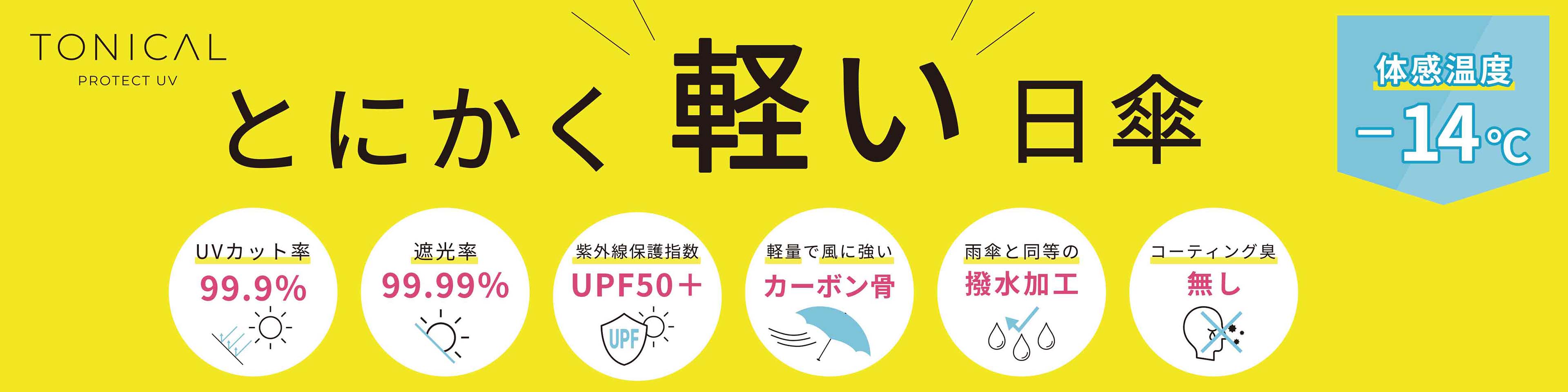 | 「TONICAL(トニカル)」は「とにかく軽い傘」の特徴を端的にしたネーミングです。 鞄に入れた事もわすれてしまうをコンセプトにした日傘です。 | | 素材 | 生地:ポリエステルポンジ、ブラックラミネート加工 中棒:アルミ 親骨:カーボン 受骨:カーボン 手元:平型PP、ゴム | | 商品サイズ | 折りたたみ時:約W5×D5×H22cm 全開時:約W84×D84×H50cm | | 備考 | - | | とにかく軽い日傘 TONICAL POINT1 高性能UVカットフィルム 新技術により「UVカットフィルム」の圧着で軽量化を実現。接着剤不使用で従来のコーティング製法による嫌な臭いもありません。 POINT2 軽くて丈夫なカーボン骨 「軽量」で「しなやか」なカーボン素材を親骨と受骨に採用することで、業界最軽量クラスでも非常に高い強度を実現しました。 POINT3 UVカット率99.9% POINT4 遮光率100% POINT5 紫外線保護指数UPF50+ POINT6 雨傘と同等の撥水加工 POINT7 体感温度-14℃ POINT12 コーティング臭無し |