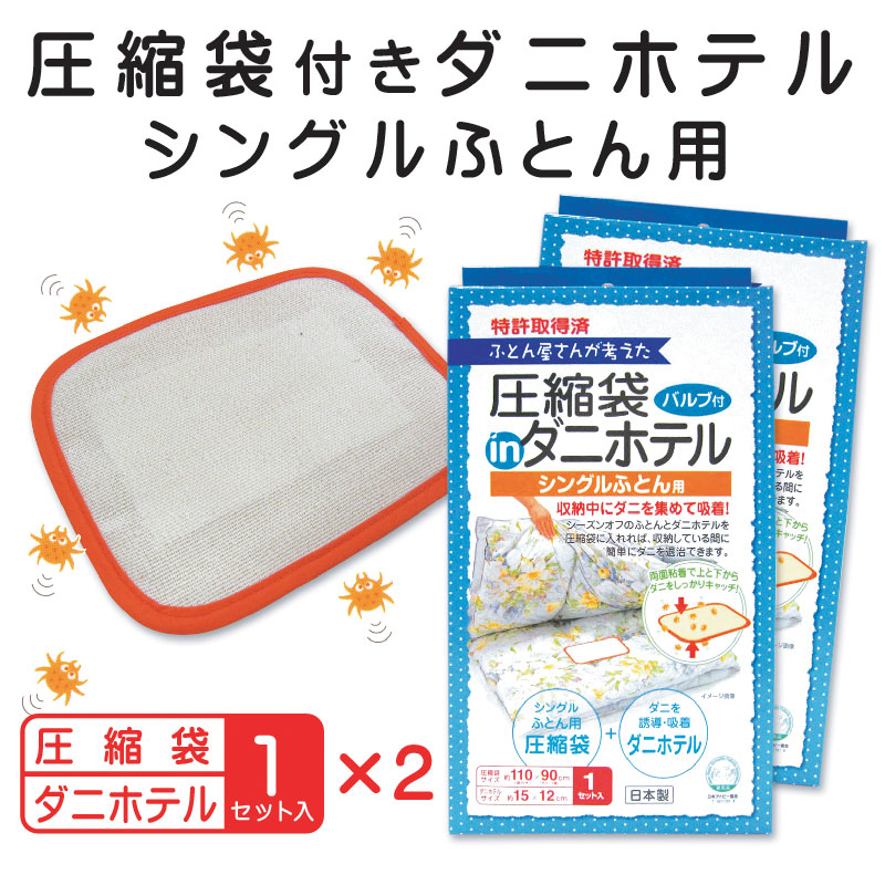 アウトレットアイテム ふとん屋さんが考えた 圧縮袋(バルブ付)in ダニホテル 2個セット シングルふとん用 日本製 収納中にダニを集めて吸着