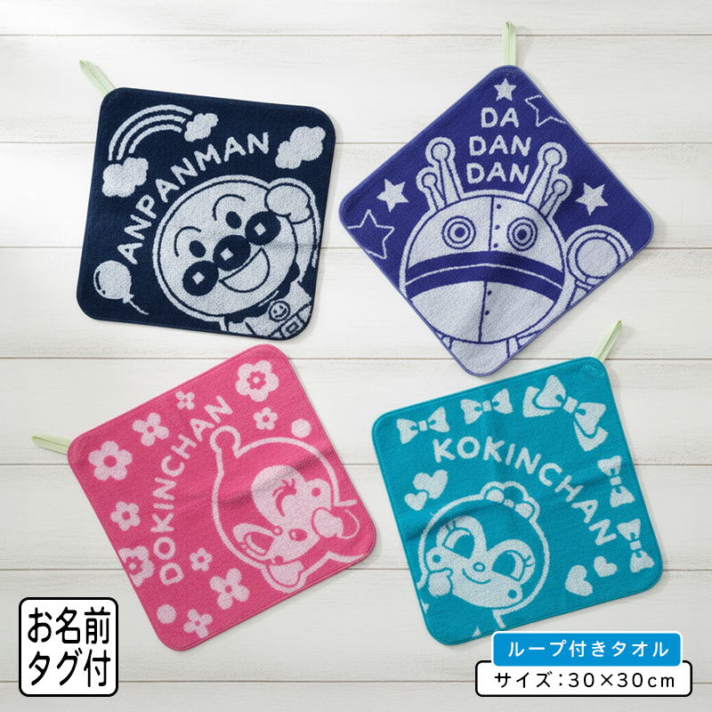 アンパンマン ループタオル 30×30cm 綿100% ジャガード織り ネームタグ付き キャラクター 保育園 幼稚園 ループ付きタオル 男の子 女の子 rt1 メール便C