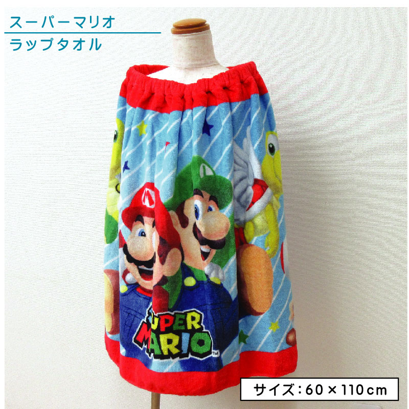 【メール便送料無料】スーパーマリオ ラップタオル 60cm丈 綿100% ホック付き 紫外線遮蔽加工 制菌加工 キャラクター キッズ 巻きタオル rp6