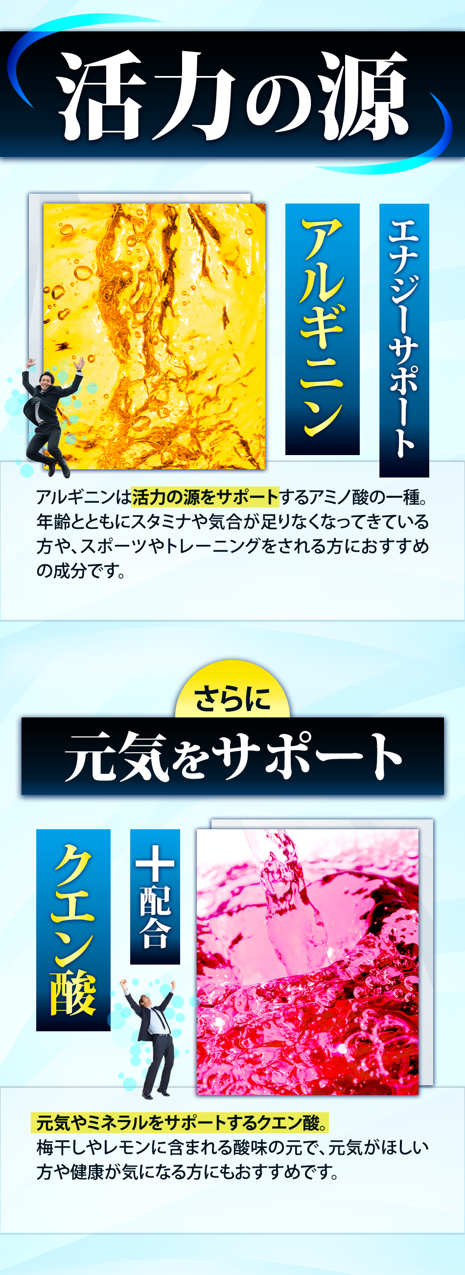 | 原材料 | デキストリン(国内製造)/L-アルギニン、ゼラチン、クエン酸、ステアリン酸カルシウム、カラメル色素、二酸化ケイ素 ※商品は原料由来の為、製造時期により色合いが多少異なる場合がございます。 |