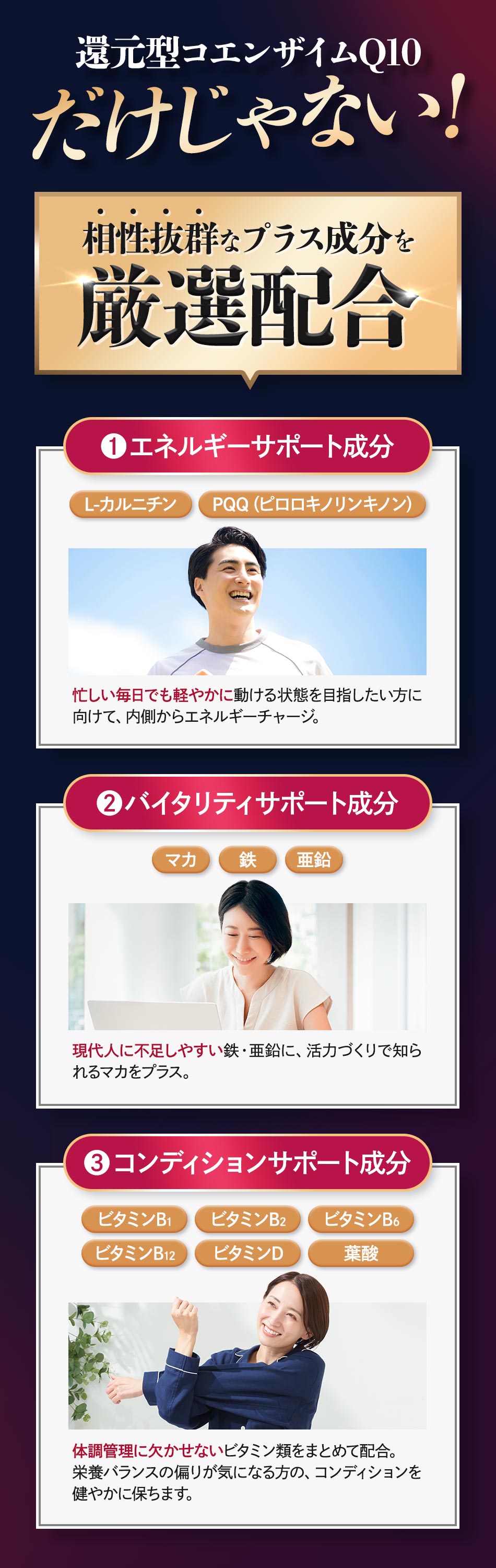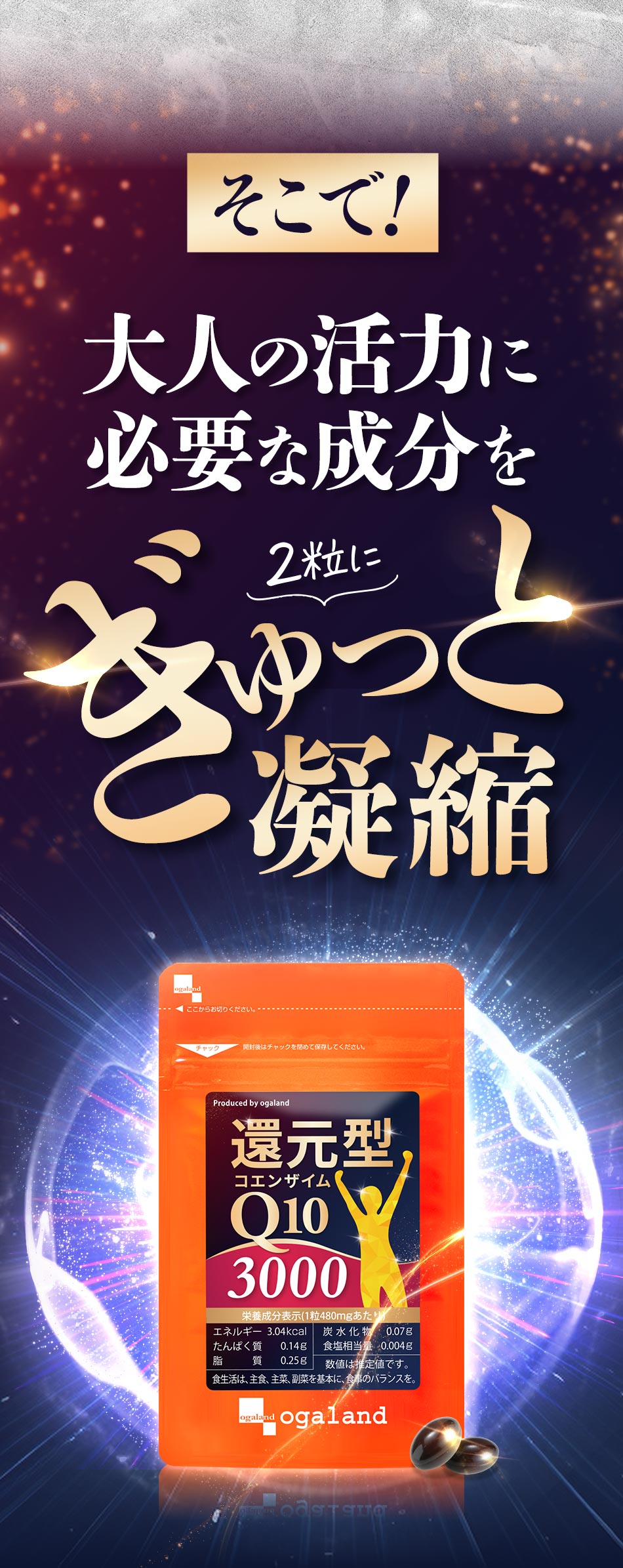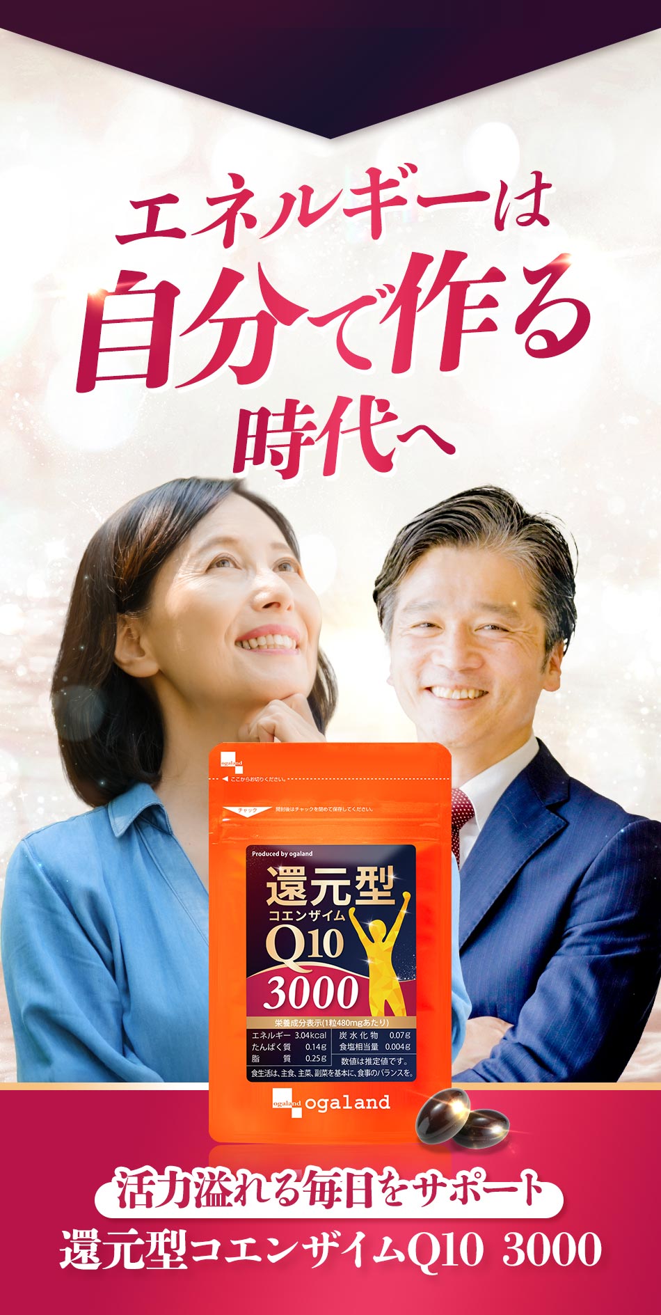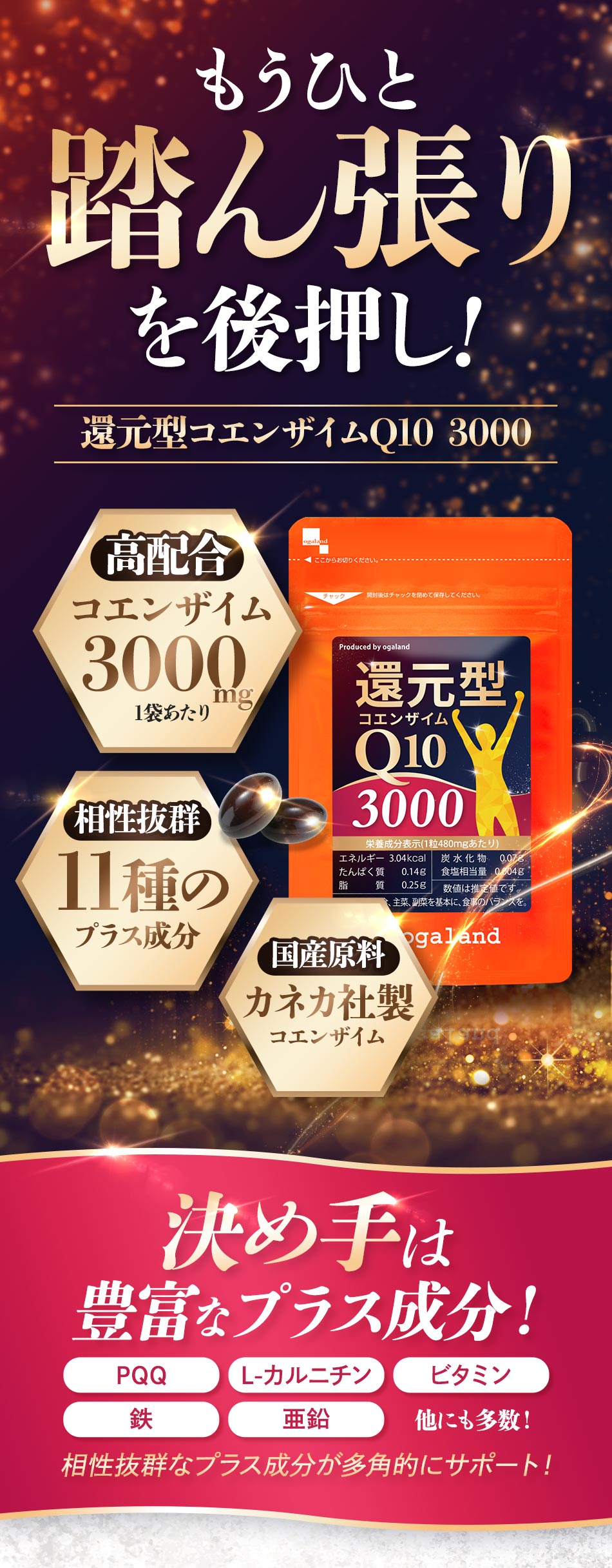 アマニ油(国内製造)、還元型コエンザイムQ10、こめ油、マカ粉末、L-カルニチン酒石酸塩、亜鉛含有酵母、ピロロキノリンキノン二ナトリウム塩/ゼラチン、グリセリン、グリセリン脂肪酸エステル、クエン酸第一鉄ナトリウム、カラメル色素、植物レシチン(大豆由来)、ビタミンB1、ビタミンB2、ビタミンB6、葉酸、ビタミンD、ビタミンB12