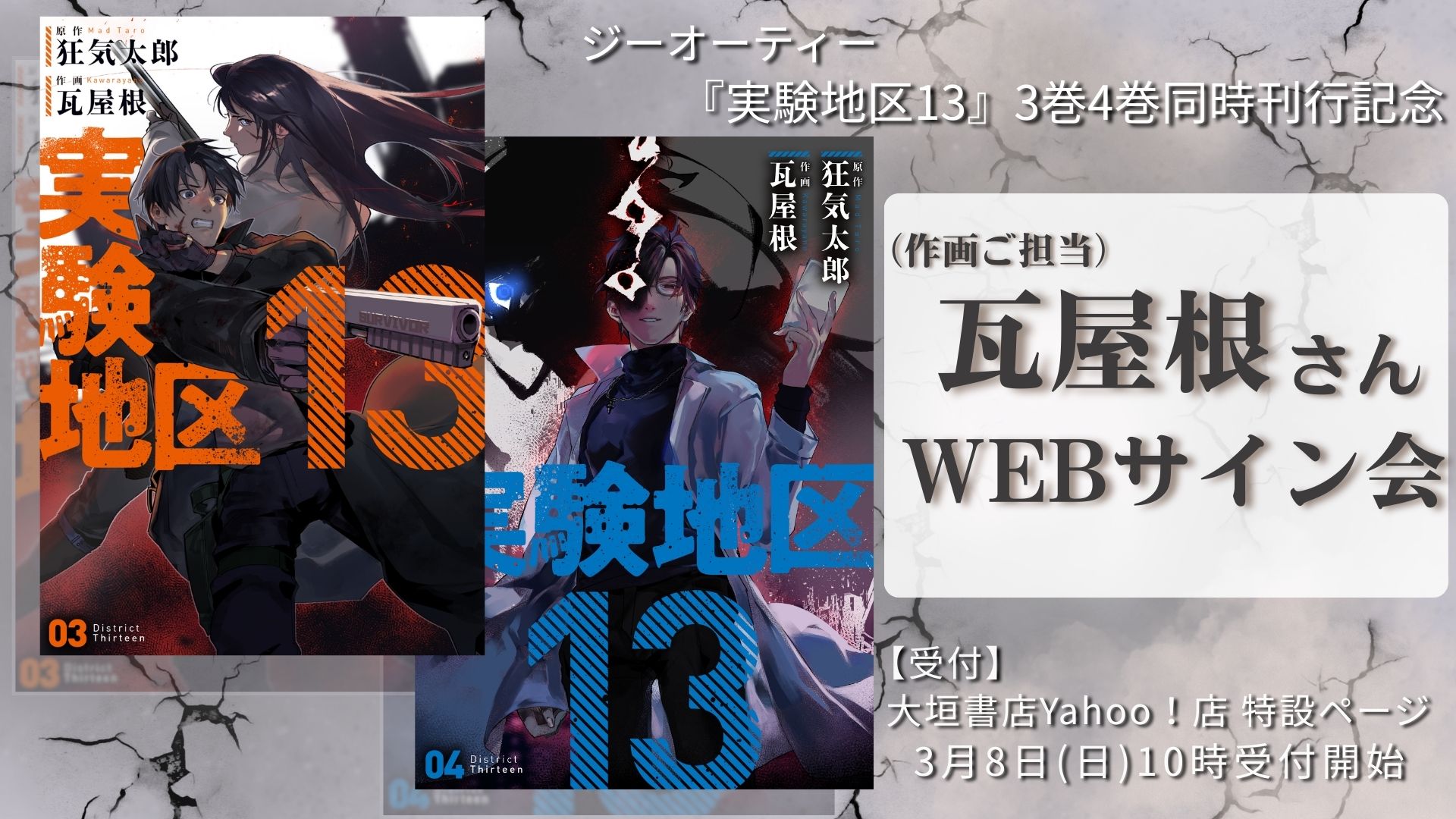 〇ジーオーティー刊『実験地区13 4巻』(2026年3月31日ごろ刊行予定)に、作画ご担当の瓦屋根さんにお名前入りのサインをいただき、3巻と4巻をセットでお届けいたします。