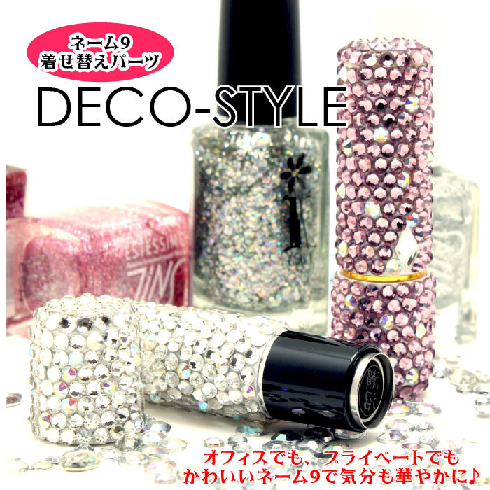 「ネーム9 着せ替えパーツ デコスタイル」は、お手持ちのネーム9をキラキラと輝くクリスタルガラスのラインストーンで装飾したエレガントなデザインのネーム印に着せ替えることができる、ホルダーとキャップのセットです。