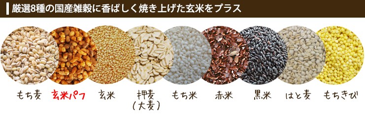 もち麦、玄米パフ、玄米、押麦(大麦)、もち米、赤米、黒米、はと麦、もちきび