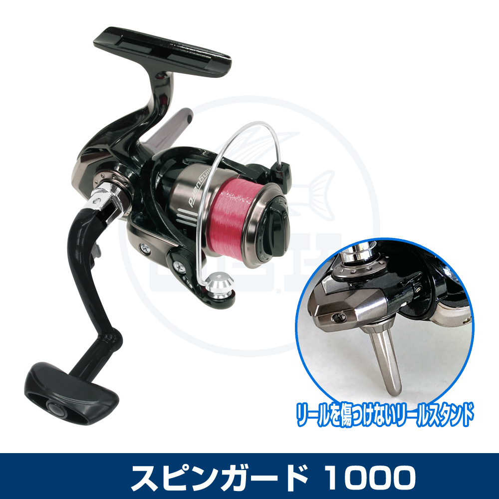 リールスタンドの付いたスピニングリール。リール本体が地面に接地せずに置くことが可能で傷からリールをガードします。