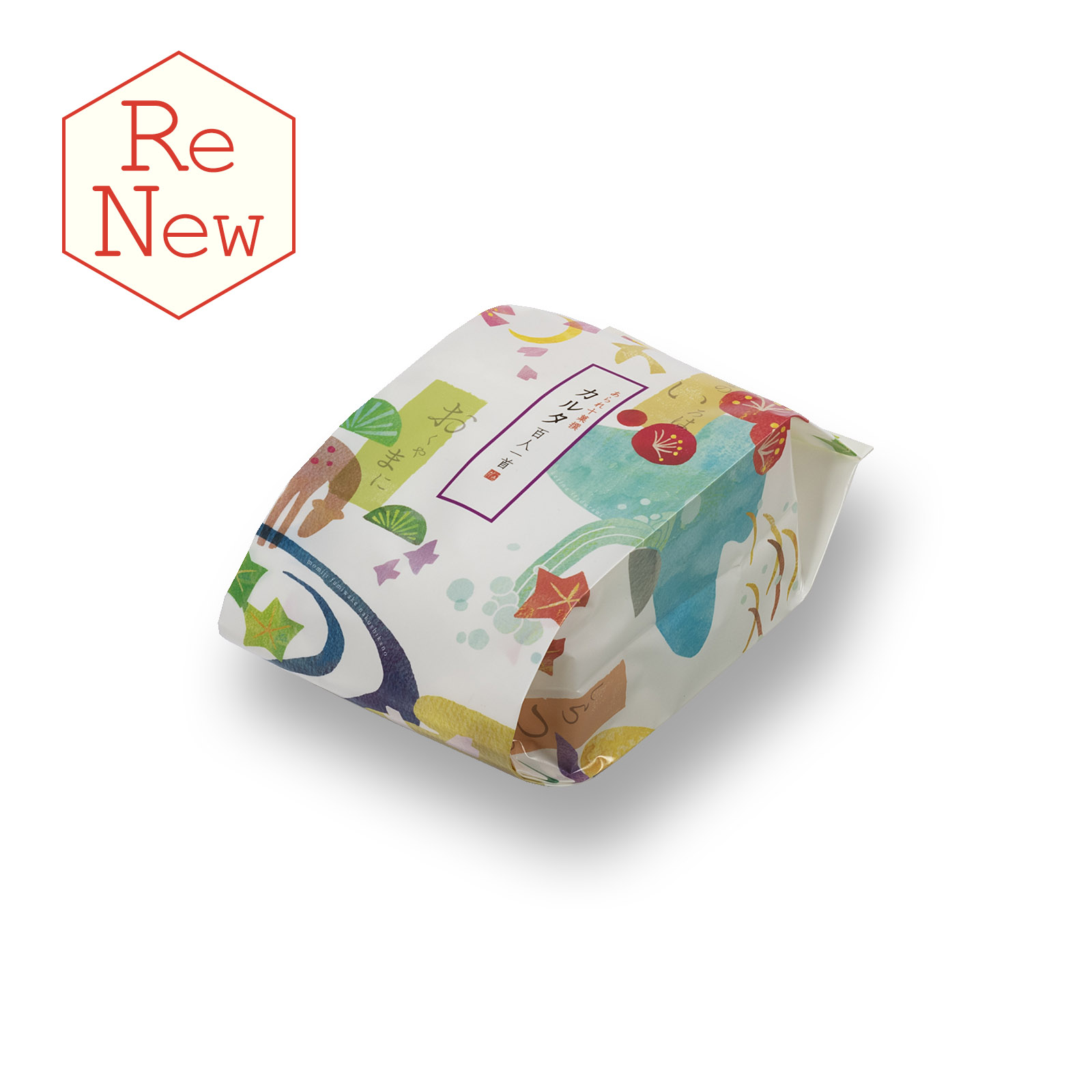 『あられ十菓撰 カルタ百人一首』は、『小倉百人一首』をより多くの方に親しんでいただきたいという想いから、百首の和歌にちなんだデザインで、個包装がカルタになるようおつくりしました。