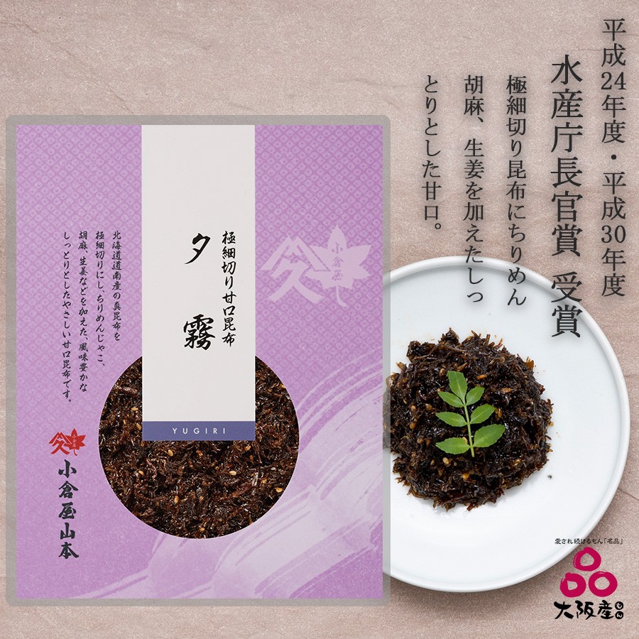 「夕霧」は、大坂新町に実在し、若くして亡くなった美しい太夫の名前。その死を大坂中が悼んだと言われ、近松門左衛門も彼女を偲び、浄瑠璃の名作を残しています。その名にちなんで、細い昆布とちりめんじゃこ、ごま、生姜などを、口当たりもやさしく仕上げたのが、小倉屋山本自慢の「夕霧」です。