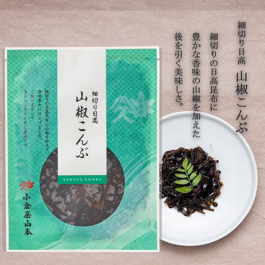 日高昆布を召し上がりやすい細切りにし、香味ゆたかな山椒を加え、独自の製法でほどよい口あたりに仕上げました。