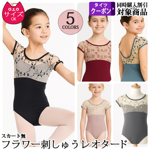 バレエレオタード 子供用 フラワー刺繍 半袖 スカート無し