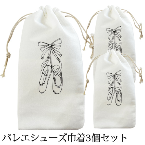 【3枚セット】バレエプリントのバレエシューズ巾着 バレエシューズケース