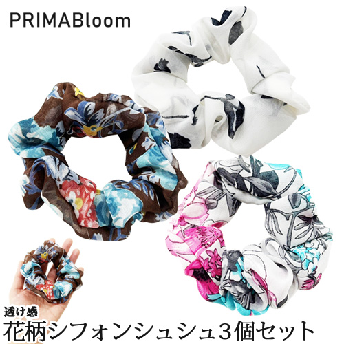 花柄プリントのシフォンシュシュ(3色セット) ヘアゴム ハンドメイド【プリマ・ブルーム】日本製
