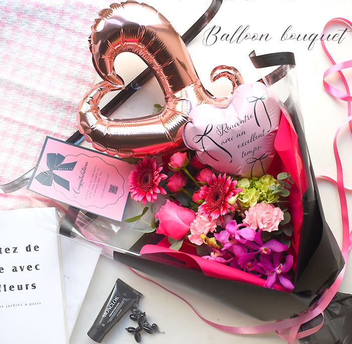 ビビッドピンク ×黒ラッピングでギュッと華やか!ハートバルーンとお花で大人っぽくキュートなブーケ
