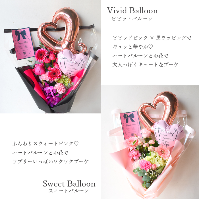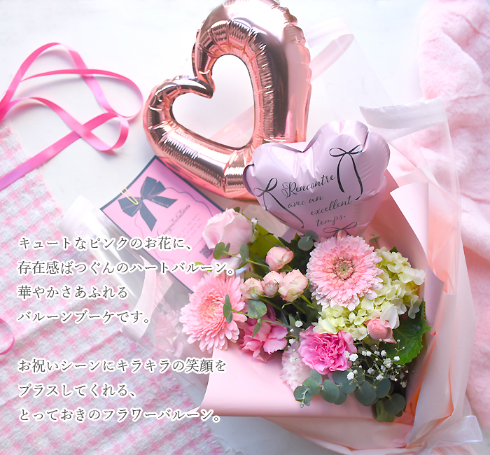 ふんわりスウィートピンク。ハートバルーンとお花でラブリーいっぱいワクワクブーケ