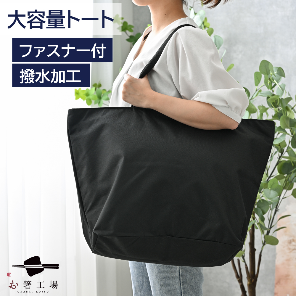 【撥水 加工】どでか トート バッグ/ 無地 黒 ファスナー付 大容量 大きい かばん 大型 特大 マザーズバッグ エコバッグ 大きめ