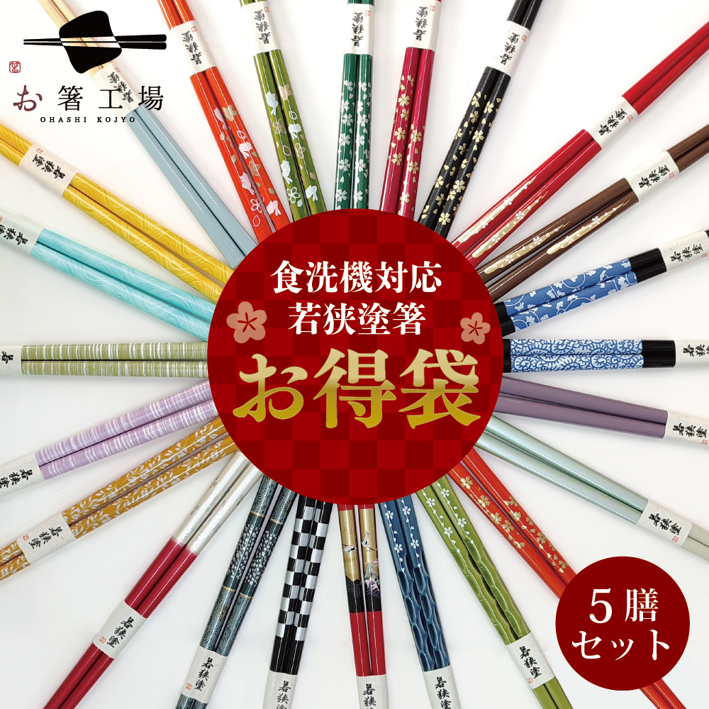 お箸工場が厳選した限定 お得袋 5膳セット/食洗機対応 色柄おまかせ 色々 箸 アソート 5膳 セット おしゃれ 若狭塗 箸 日本製 国産 滑り止め付 和風 箸セット