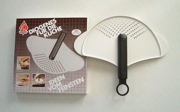 ・サイズ:25x30x2.7cm・重量:135g・材質:ABS樹脂・ドイツ・ディオゲネス社製・色々なサイズの鍋に簡単にセットできます・こし器として熱湯を安全に湯きり、野菜や果物の下ろし器にも使える便利グッズ・欧州で大変人気の商品です