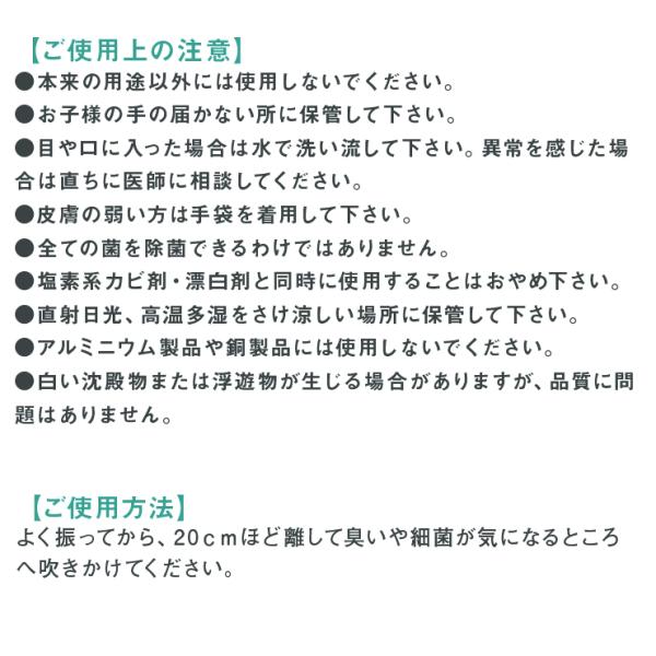 よく振ってから、20cmほど離して臭いや細菌が気になるところへ吹きかけてください。