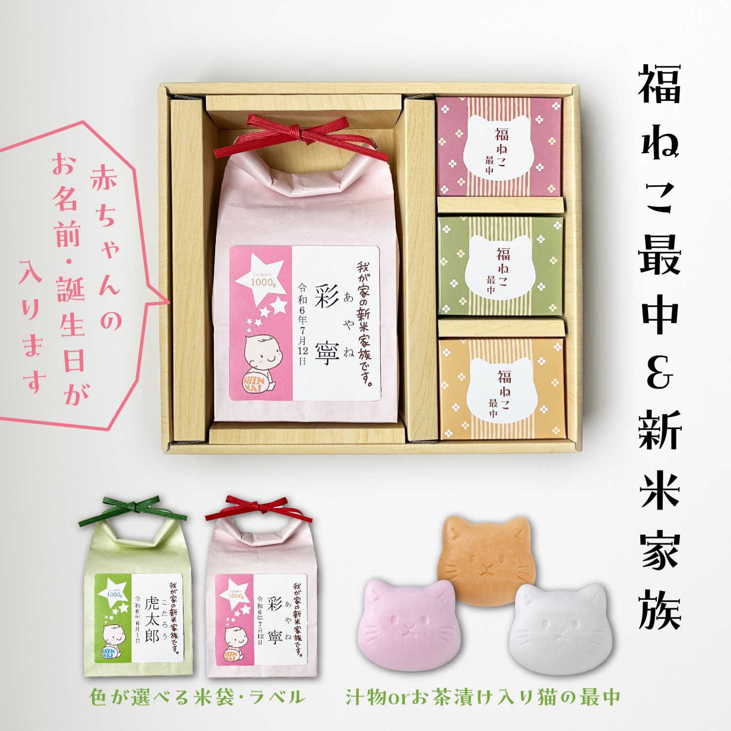 袋に名入れができる1000gの新潟産コシヒカリ【新米家族】と人気の猫型最中【福猫最中】のセットで、出産内祝いに最適なギフトです。