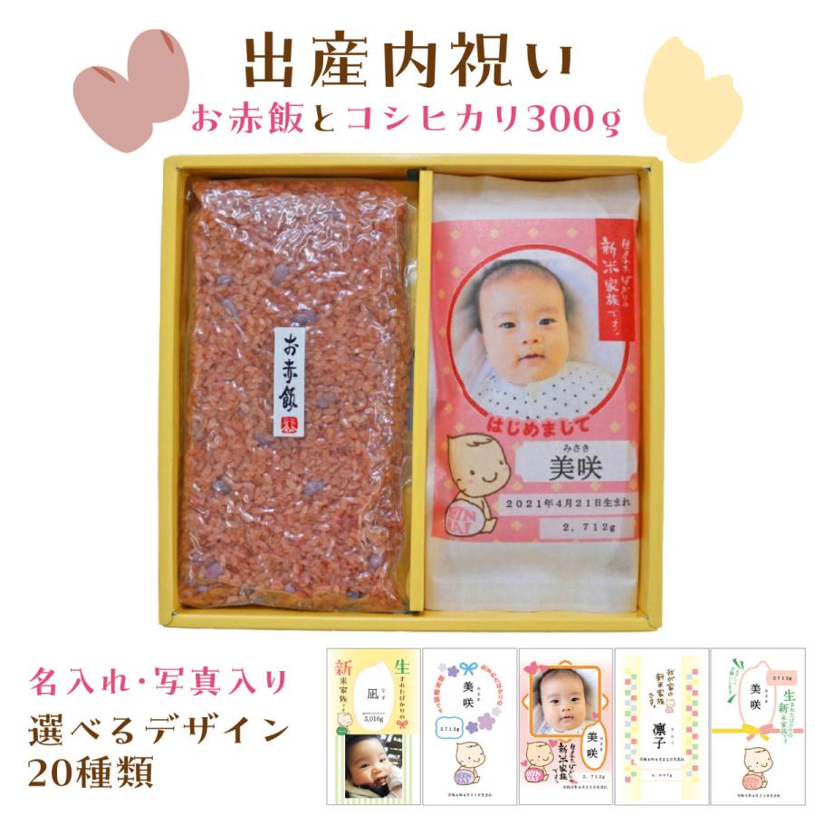 新潟産コシヒカリとお赤飯のセットの出産内祝いギフト。コシヒカリの袋にお子様のお名...