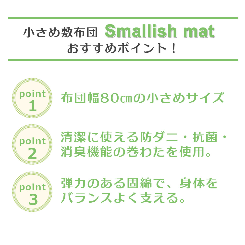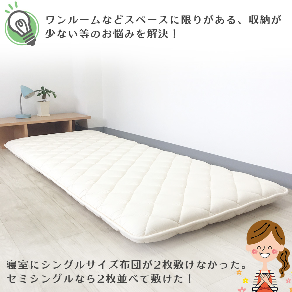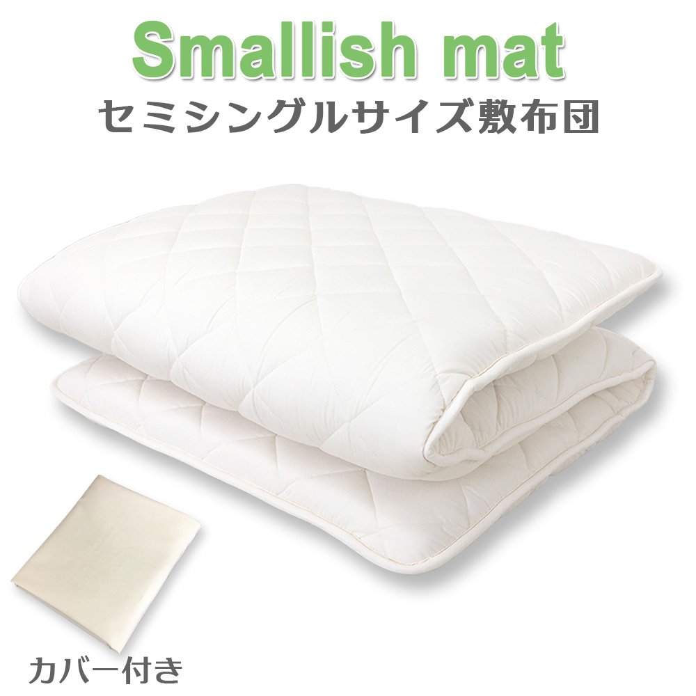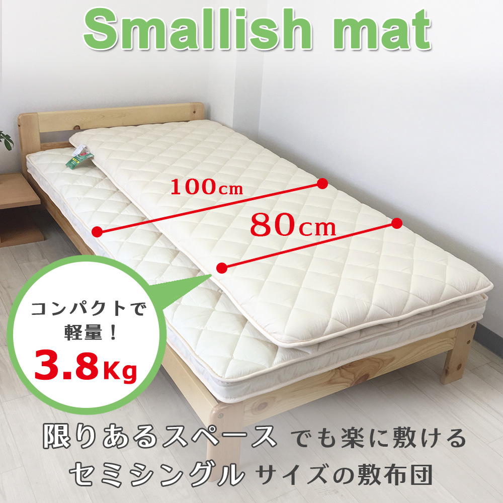 ●小さめ敷き布団Smallish matは、ワンルームなどスペースに限りがある、寝室に布団が2枚敷けない、収納が少ない等のお悩みを解決してくれるセミシングルサイズの敷き布団です。