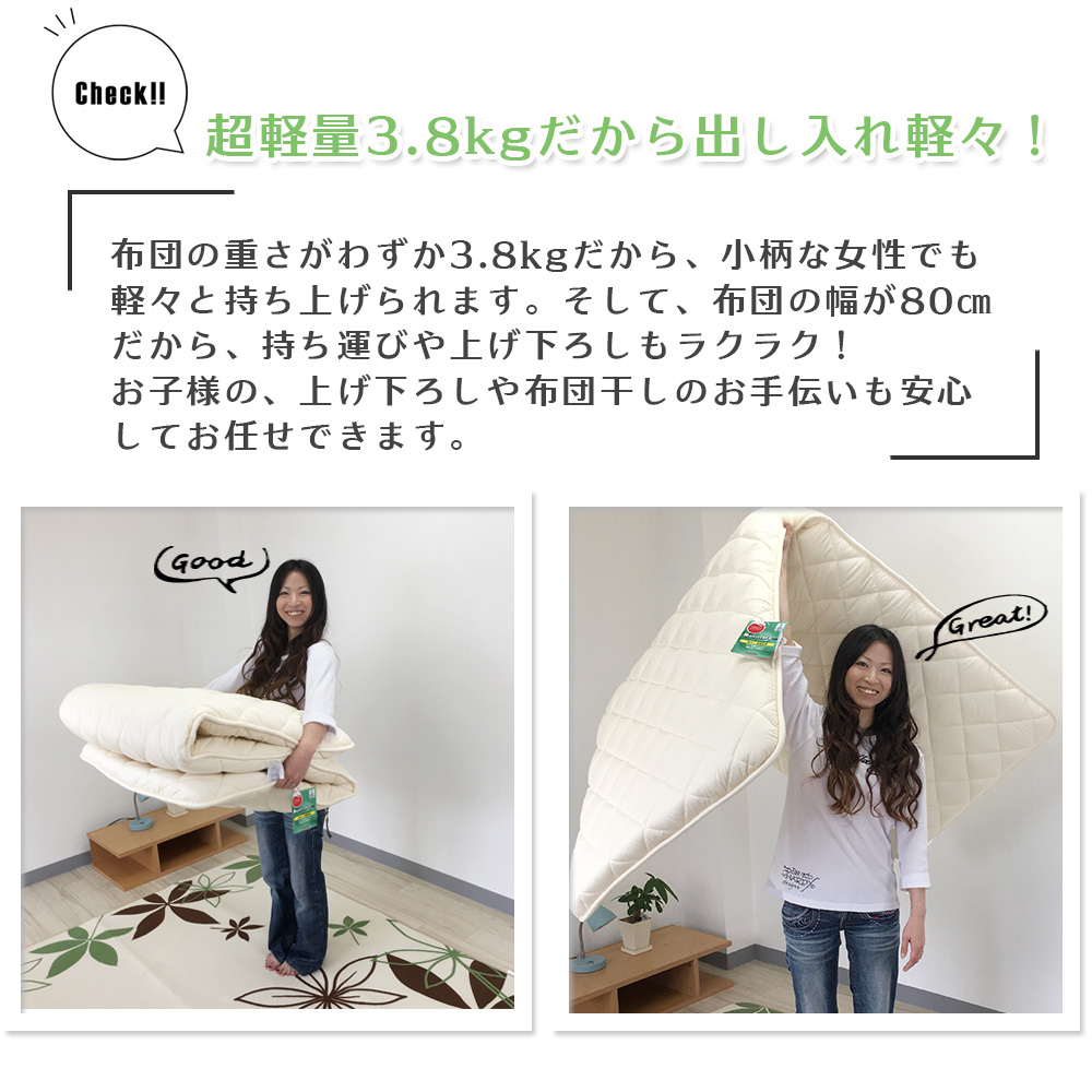 ●敷き布団の幅は、80cmで重さ3.8kgと軽量な布団なので、女性やお子様でも布団の上げ下ろしが楽にできます。