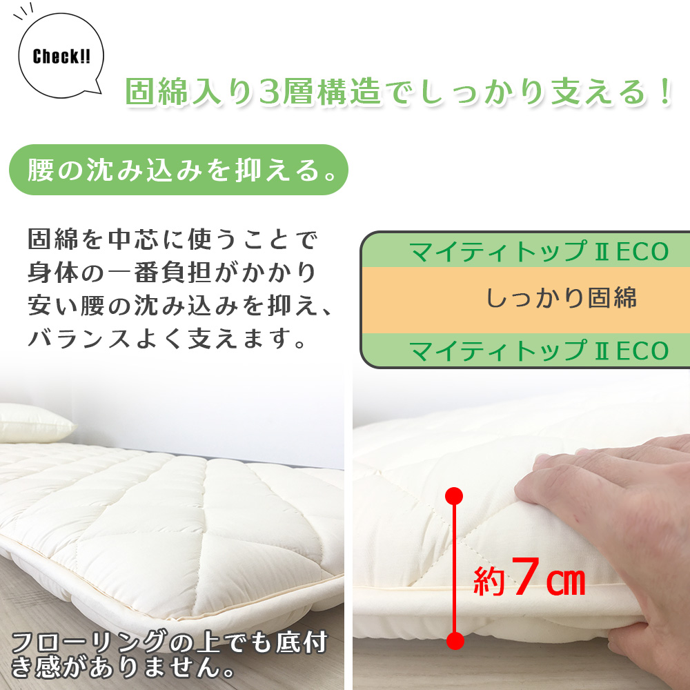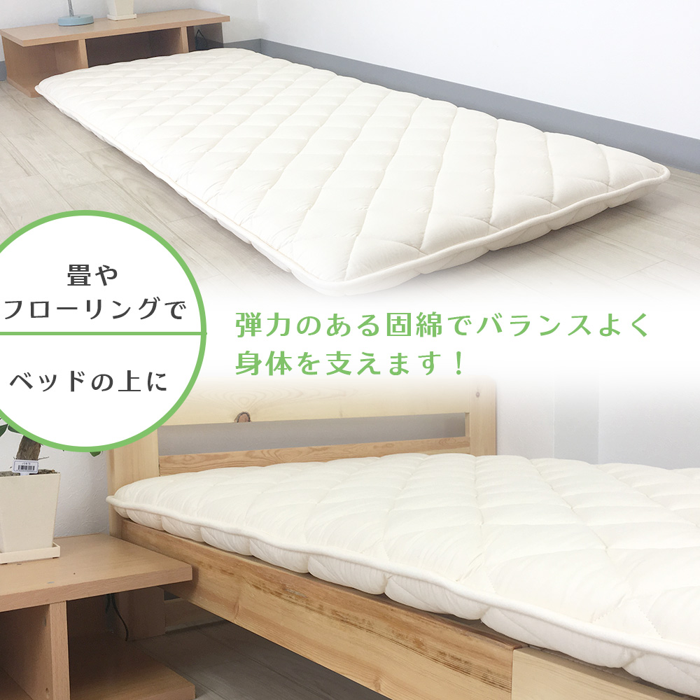 | 素材 | 【敷布団】側地:綿 35%、ポリエステル 65% 巻き綿:帝人 マイティトップ(ポリエステル100%) 固綿:ポリエステル100% 【カバー】側生地:綿 35%、ポリエステル 65% |