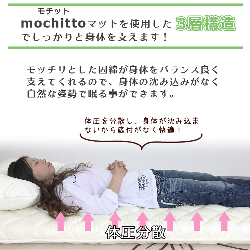 雲のようにソフトな巻き綿でモチットマットを包み込み、快適な寝心地です。