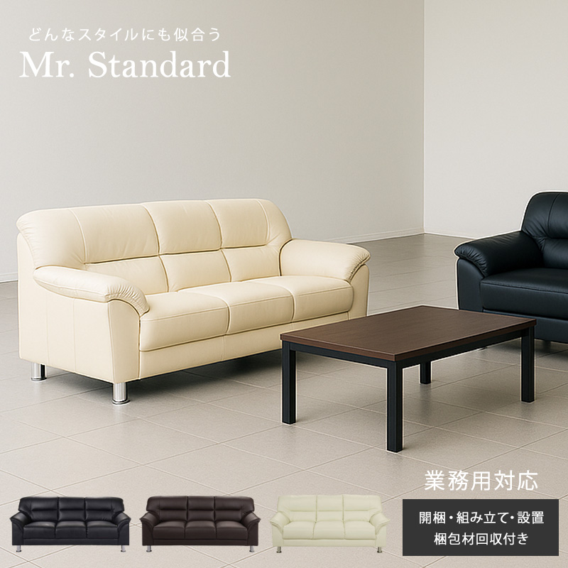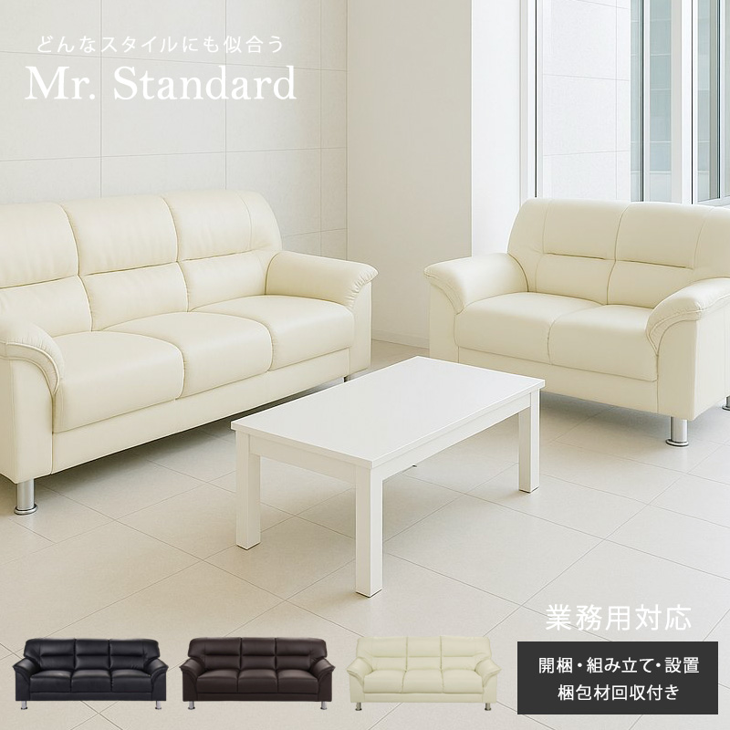 シンプルなデザイン・カラーの合成皮革に品の良さがでるクロームメッキを極太のスチール脚で安定感のあるソファ