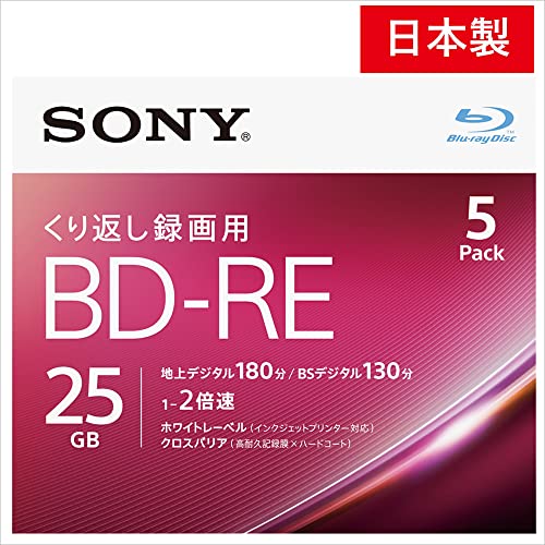 ソニー 日本製 ブルーレイディスク BD-RE 25GB (1枚あたり地デジ約3時間) 繰り返し録画用 5枚入り 2倍速ダビング対応 ケース付属
