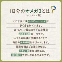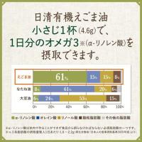栄養成分(小さじ1杯(4.6g)当たり):エネルギー 126kcal、たんぱく質0g、脂質14g、炭水化物0g、食塩相当量0g、α−リノレン酸2.5g