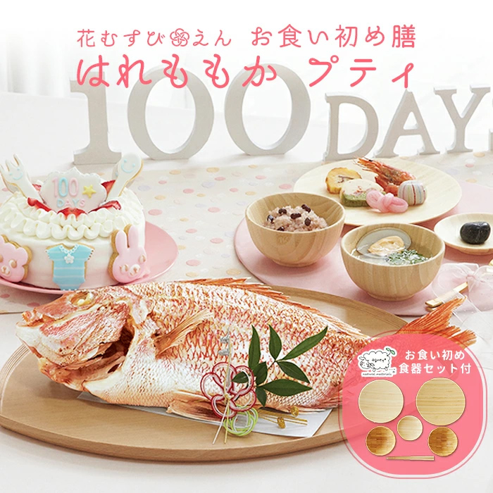 | 内容量 | ●祝い鯛姿焼き(水揚げ時加工前1.5kg / 下処理焼き加工後800g)×1 ●縁起物お料理5品×1 ●赤飯×1 ●蛤×1 ●お吸い物の素×1 ●生クリーム5号ケーキ(直径約15cm)×1 ●アイシングクッキー8枚(スター×2、ナイフ×1、フォーク×1、ウサギ×1、クマ×1、ロンパース×1、100daysプレート×1) ●歯固めの石×1 ●祝い箸×1 ●鯛飾り×1 ●敷き紙(白)×1 ●agneyお食い初め食器セット(お椀(φ10×高さ 5cm 容量約120ml) ×2、お皿×3( 直径18・16・9cm)お箸×1膳 (16.5cm)) ギフトボックス入(サイズ:34×25×H8cm 重さ:約740g) |