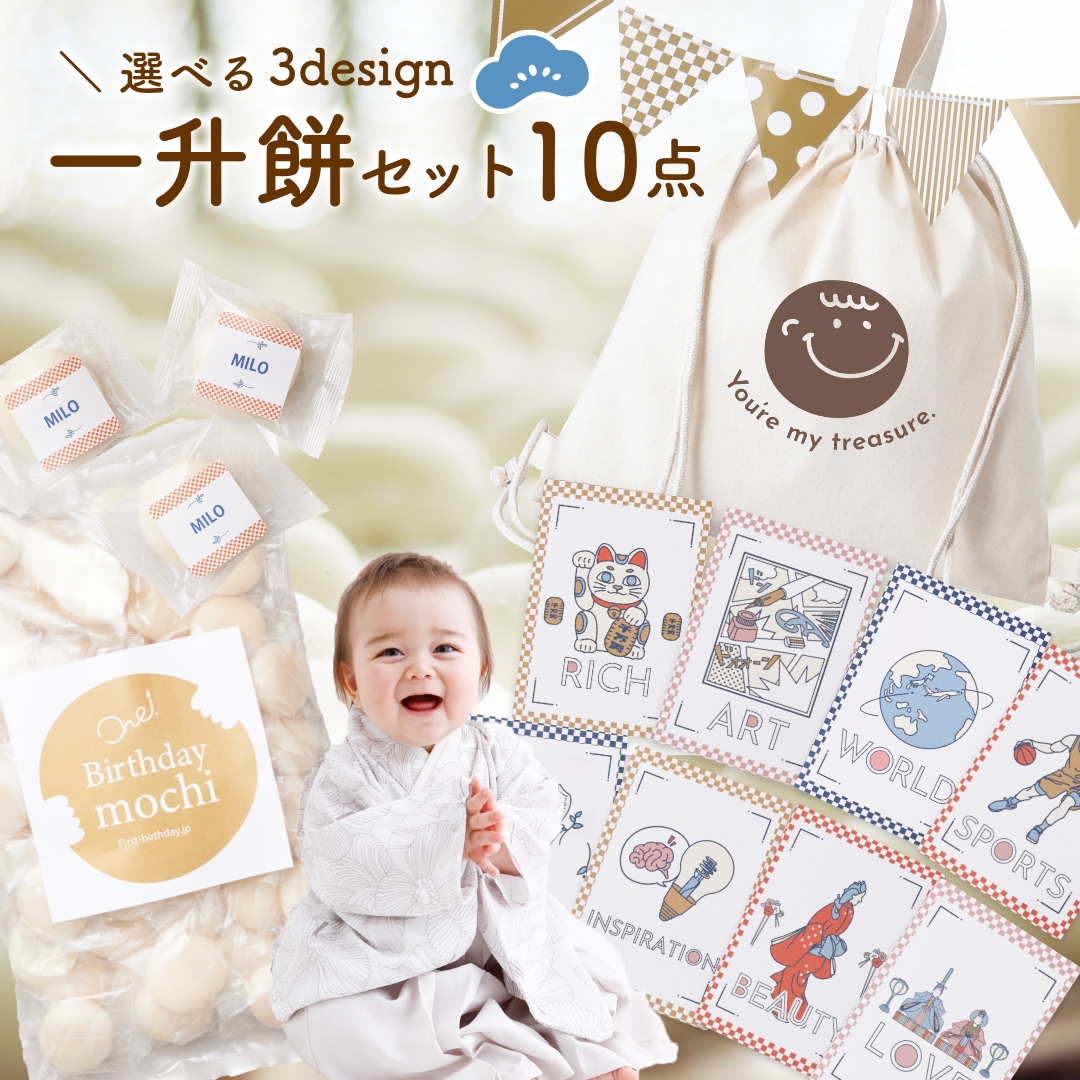 | セット内容 | ●小分け餅(1800g) ●選び取りカード(1袋8枚入) ●お名前シール(1シート24片) ●メモリアルカード×1 ●リュック×1 ●ガーランド×1 ●タペストリー×1 ●小分け袋×5 ●砂糖入りきなこ(10g)×3 ●お祝いの手引書 |