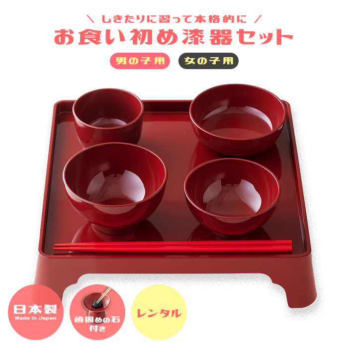 セット内容 | ●膳×1、椀×4(平椀:Φ11×5.5cm、飯椀:Φ10×5.8cm、汁椀:Φ9.2×7cm、つぼ椀:Φ8.5×6cm、膳:27.7×27.7×5.7cm(ウレタン塗装))、箸×1 ●箱サイズ 28×28×6cm ●箸の長さ 22.5cm(ポリエステル塗装) ●歯固め石(約3〜4cm)×1 ※天然石の為大きさや形に個体差があります ※煮沸消毒してからご使用下さい。 ●返却用ヤマト運輸着払伝票×1 ●説明書 |