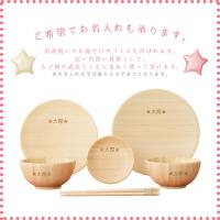| セット内容 | ●お椀x 2 (φ10 x 高さ 5cm 容量約120ml) ●お箸x 1膳 (16.5cm) ●お皿x 3( 直径18・16・9cm) ギフトボックス入り ●パッケージサイズ:34x25xH8cm 重さ:約740g ※お届けまでに2〜4週間かかります 各食器に5文字(半角7文字)までお名入れ可能です。 ※字体は「MSP ゴシック」のみでの対応となります。 |