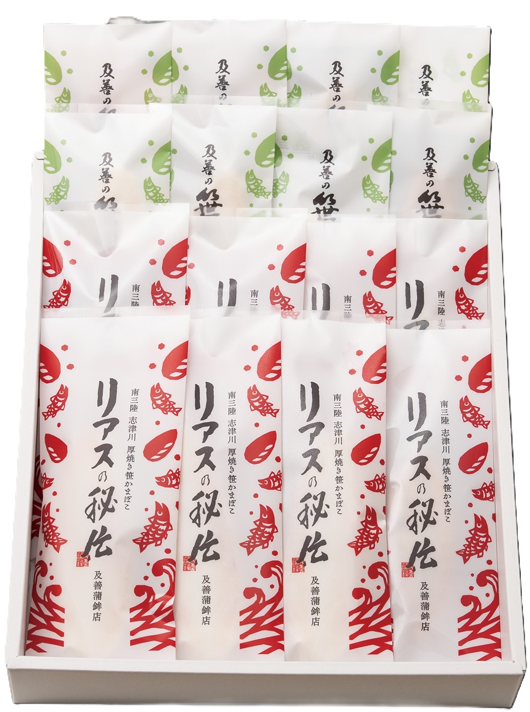 上質なスケソウダラを原料に半世紀以上作り続けている笹かまぼこ「及善の笹かまぼこ」と、最高級の原料を使用して焼き上げた、厚焼きの笹かまぼこ「リアスの秘伝」の食べ比べセット。