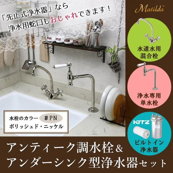 アンティーク水栓マチルダのキッチン蛇口&単水栓にビルトイン浄水器を組み合わせた