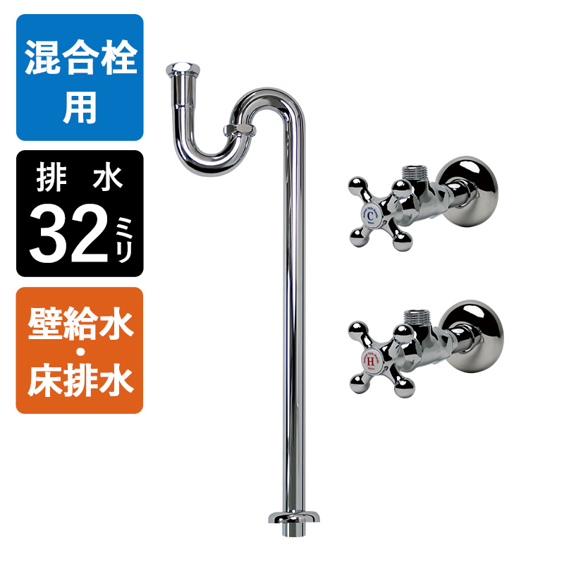 給水ホース付混合栓用 給水金具・排水部材Eセット(壁給水・床排水32ミリ規格・クロム) Sトラップ アングル止水栓