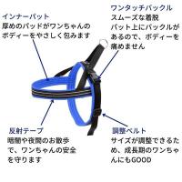 しっかりした反射テーブ付きなため夜のお散歩でも安心安全です。背中のハンドル部で緊急時にもコントロール可能。