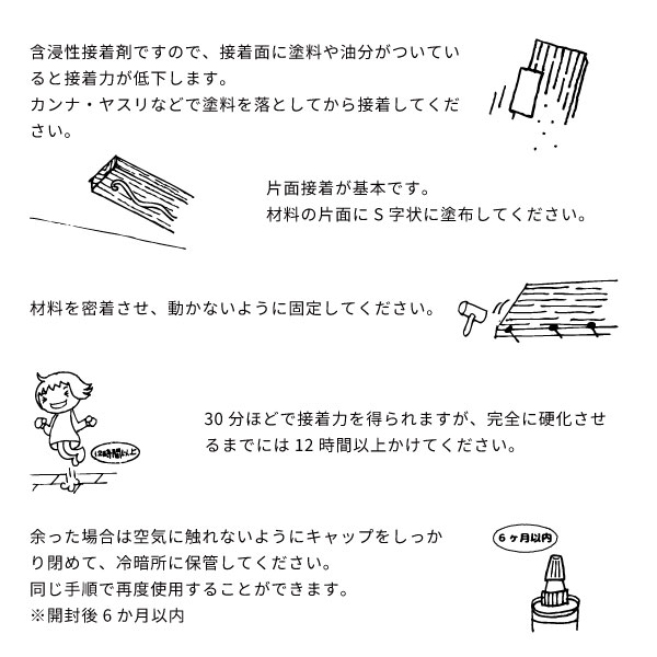 ※広葉樹などの目が詰まった木(木の表面に凹の部分が少ない)や、樹脂塗装された木部の接着には向いておりません。※常時水のかかる箇所や屋外などでの用途には使用しないでください。