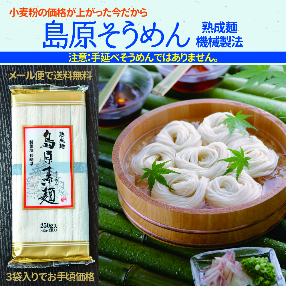 送料無料 お得 安い 島原 素麺 そうめん 250g×3袋( 7〜8食 15束 ) 手延べではありません 長崎県 島原半島 伝統 製麺師 南島原市 西有家 須川 メール便