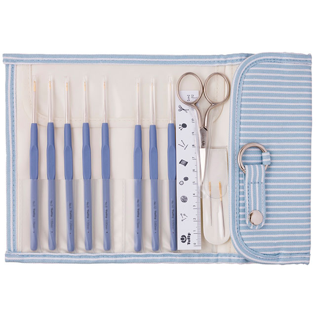 手首への負担を軽減し、疲れにくいクッショングリップ付きのレース針8本、シルバーハンドルのイタリア製高級手芸はさみ、かわいいケース、とじ針2本、ものさしがそろった使いやすいセットです。