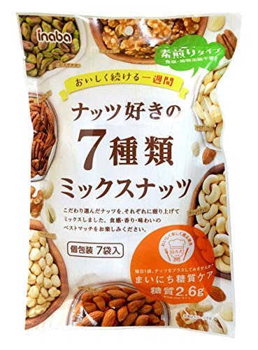 こだわり選んだ7種類のナッツ(アーモンド、くるみ、カシューナッツ、ヘーゼルナッツ、マカダミアナッツ、ピーカンナッツ、ピスタチオ)を、それぞれ個別に煎り上げてミックスしました。毎日の糖質ケアにナッツをプラスしてみませんか?個包装(22g当たり、糖質2.6g)です。おいしく続けられるよう1週間分の個包装7袋入りです。