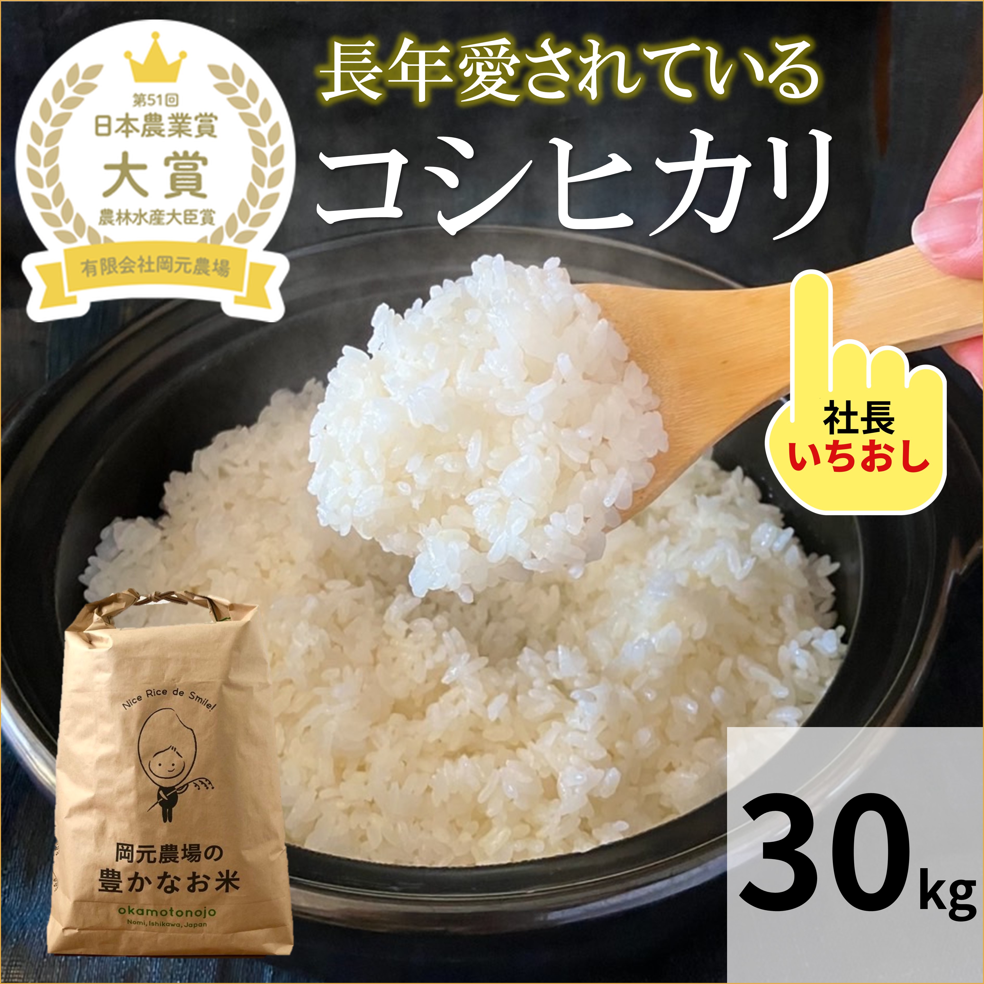 ●岡元農場の豊かなお米コシヒカリの特徴●・食べたときに粘りがあり、お米本来の甘味を感じられるおいしいお米です。・料理では、あっさりとした和食との相性は抜群です。お米のおいしさを最大限に味わうなら、お漬物などのシンプルなご飯のお供がおすすめです。・精白米の場合、白く艶があり、輝いています。・岡元農場では、農薬をできる限り控えています。一般的な慣行栽培よりワンランク上のコシヒカリです。・収穫後は、最適な温度のお米専用冷蔵庫で保管しています。・精白米をお選びいただいた場合、発送直前に精米して袋詰めしますので、香りが格別です。・第三者機関の厳正な検査をうけており一等米です。●日本農業賞大賞を受賞しました●岡元農場は2022年に第51回日本農業賞大賞を受賞しました。日本農業賞とは、「NHK」と「JA全中」、「JA都道府県中央会」が主催して、日本農業の確立をめざし、意欲的に経営や技術の改革にとりくみ、地域社会の発展にも貢献している農業者と営農集団が表彰されます。その日本農業賞において、最優秀の証である大賞を受賞しました。これは長い間、岡元農場を支えてくださっている地主様、お客様、地域の皆様のおかげです。●岡元農場とは石川県能美市でお米と加賀丸いもを生産している農家です●岡元農場のスローガン【Nice Rice de Smile! 〜おいしいごはんで笑顔に〜】私たち岡元農場は日本や地域の水田・自然・環境を守るという事はもちろんですが、お客様に当たり前に安心して美味しいお米を召し上がっていただきたいから、本気で米づくりに励んでいます。加賀平野で白山連峰からの伏流水と日本海の風をうけてミネラルたっぷりのお米と加賀丸いもを栽培しています。農家なので、生産〜収穫〜販売までを一貫して行っています。そのため、【農家直送】で高品質のお米を自信をもってお送りいたします。加賀丸いもはやまのいも(とろろ)で地域の特産農産物であり、農林水産省の「GI認証」も取得しております。●お米の保管について●お米の到着後はなるべく15℃以下の冷蔵庫等での保管をお勧めいたします。高温多湿を避けて、冷暗所で保存してください。保存場所としては冷蔵庫が最適で、入らない場合は日の当たらない冷暗所で保存してください。直射日光が当たる部屋や、高温になる部屋などは虫発生の原因になりますのでおやめください。お米には消費期限はありませんが、長期保存を行うと品質の劣化や虫が発生する場合がありますので、なるべく早くお召し上がりください。※ご購入前に必ずご確認ください※・画像はイメージです。・製造ラインの仕様上、まれに茶色の米ぬかのかたまりが混入する可能性がございます。・パッケージは、かわることがあります。・発送梱包は、環境に配慮し簡易包装に努めております。予めご了承ください。・食品のため、返品・交換については不可となります。・商品に不都合がございましたら、商品到着後3日以内にご連絡をお願いします。・こちらは送料込みの商品です。北海道・九州・沖縄のお客様は別途料金がかかります。ご了承くださいませ。・佐川急便の規定により、法人宛のお荷物は時間指定を承ることができません。もしご注文時に時間指定をされた場合、基本的には「希望」として扱われ、配達時間の確約はできかねますのでご了承くださいませ。