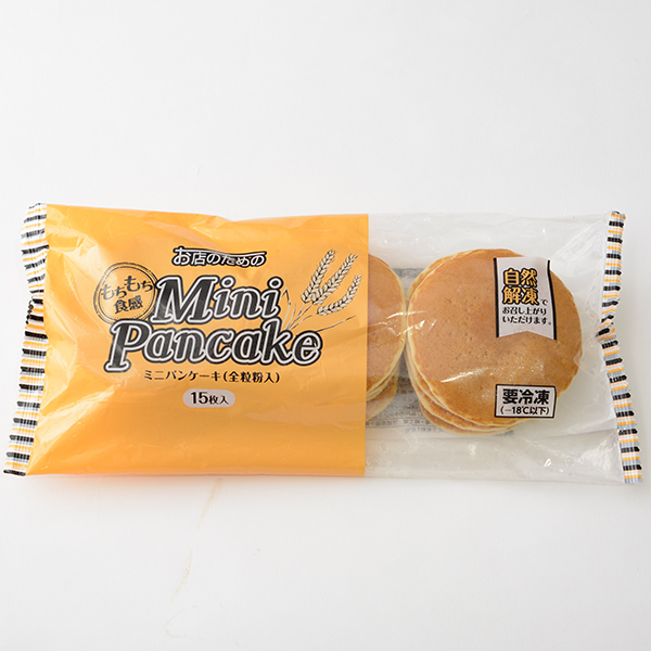 食物繊維や鉄分を豊富に含む、全粒粉を使用したミニパンケーキです。ほのかな甘みとふんわりとしたもちもち食感が特徴。自然解凍できるので、ビュッフェ等にも最適なミニパンケーキです。<アレルゲン>卵、乳、小麦、大豆【自然解凍の場合】凍ったままの製品を袋から取り出し、重ならないように並べて解凍してください。※解凍後はお早めにお召し上がりください。●解凍時間の目安:室温(約25℃)で約30分【電子レンジ調理】必ず外袋から取り出してください 凍ったままの製品を袋から取り出し、重ならないように耐熱皿に並べ、ラップをかけずに加熱してください。 ●調理時間の目安・2枚/500W〜600W:約40秒、1500W:約10秒・4枚/500W〜600W:約1分、1500W:約20秒